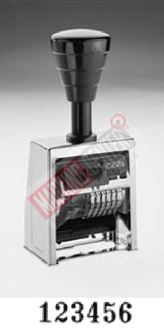 Spolehlivé, stabilní, profesionální šestimístné paginovací razítko (=po otisku se automaticky zvyšuje/snižuje tištěné číslo). Lesklý, niklovaný kovový stojan. 6 koleček z liteřiny, zasunutelné nuly.