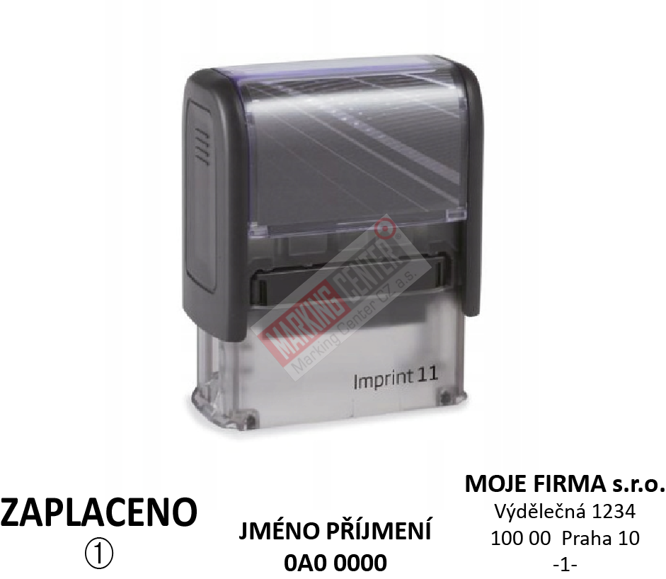 Samobarvicí razítko Imprit 8911, určené na 1-4 řádky textu, aby byla zaručená dobrá čitelnost textu. Minimální počet je 50 ks razítek na objednávku. Velikost razítka, barva strojku a otisku musí být stejná, text se může lišit, např. seznam 50 jmen nebo číslováním 1-50.