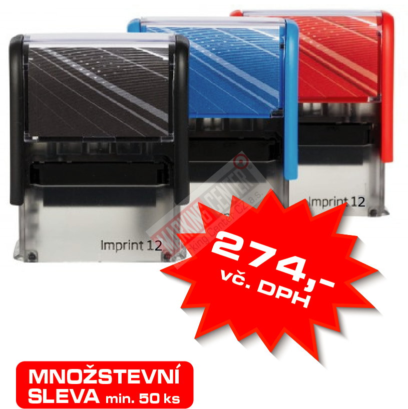 Samobarvicí razítko Imprit 8912, určené na 1-5 řádků textu, aby byla zaručená dobrá čitelnost textu. Minimální počet je 50 ks razítek na objednávku. Velikost razítka, barva strojku a otisku musí být stejná, text se může lišit, např. seznam 50 jmen nebo číslováním 1-50.