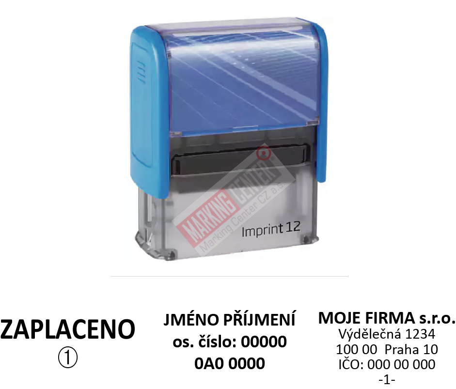 Samobarvicí razítko Imprit 8912, určené na 1-5 řádků textu, aby byla zaručená dobrá čitelnost textu. Minimální počet je 50 ks razítek na objednávku. Velikost razítka, barva strojku a otisku musí být stejná, text se může lišit, např. seznam 50 jmen nebo číslováním 1-50.