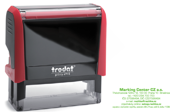 Trodat printy 4915* Samobarvicí razítko Trodat 4915, doporučený počet 7 řádků textu, aby byla zaručená dobrá čitelnost textu. rozměr otisku je max 69x24 mm barva razítka: šedá, bílá, červená, zelená, modrá, fialová barva otisku:  výběr z 16 barev možnost dodání suchého polštářku, ten slouží k napln... celý popis