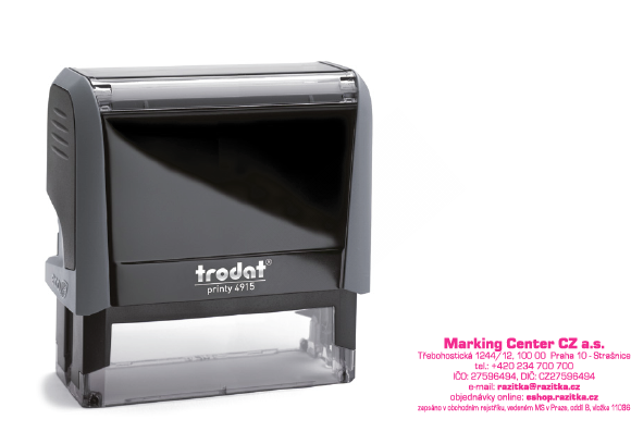 Trodat printy 4915* Samobarvicí razítko Trodat 4915, doporučený počet 7 řádků textu, aby byla zaručená dobrá čitelnost textu. rozměr otisku je max 69x24 mm barva razítka: šedá, bílá, červená, zelená, modrá, fialová barva otisku:  výběr z 16 barev možnost dodání suchého polštářku, ten slouží k napln... celý popis