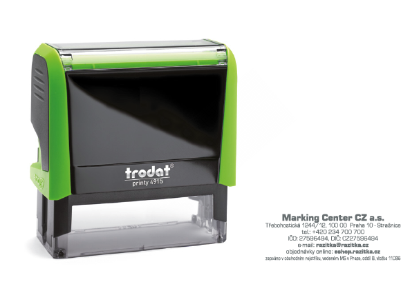 Trodat printy 4915* Samobarvicí razítko Trodat 4915, doporučený počet 7 řádků textu, aby byla zaručená dobrá čitelnost textu. rozměr otisku je max 69x24 mm barva razítka: šedá, bílá, červená, zelená, modrá, fialová barva otisku:  výběr z 16 barev možnost dodání suchého polštářku, ten slouží k napln... celý popis