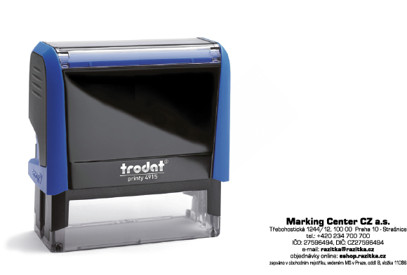 Trodat printy 4915* Samobarvicí razítko Trodat 4915, doporučený počet 7 řádků textu, aby byla zaručená dobrá čitelnost textu. rozměr otisku je max 69x24 mm barva razítka: šedá, bílá, červená, zelená, modrá, fialová barva otisku:  výběr z 16 barev možnost dodání suchého polštářku, ten slouží k napln... celý popis
