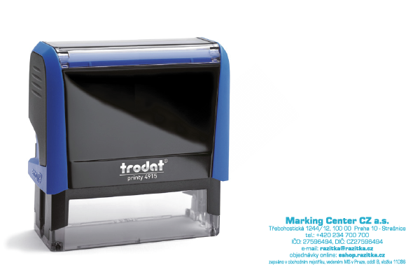 Trodat printy 4915* Samobarvicí razítko Trodat 4915, doporučený počet 7 řádků textu, aby byla zaručená dobrá čitelnost textu. rozměr otisku je max 69x24 mm barva razítka: šedá, bílá, červená, zelená, modrá, fialová barva otisku:  výběr z 16 barev možnost dodání suchého polštářku, ten slouží k napln... celý popis