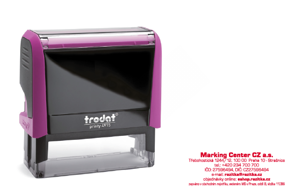 Trodat printy 4915* Samobarvicí razítko Trodat 4915, doporučený počet 7 řádků textu, aby byla zaručená dobrá čitelnost textu. rozměr otisku je max 69x24 mm barva razítka: šedá, bílá, červená, zelená, modrá, fialová barva otisku:  výběr z 16 barev možnost dodání suchého polštářku, ten slouží k napln... celý popis