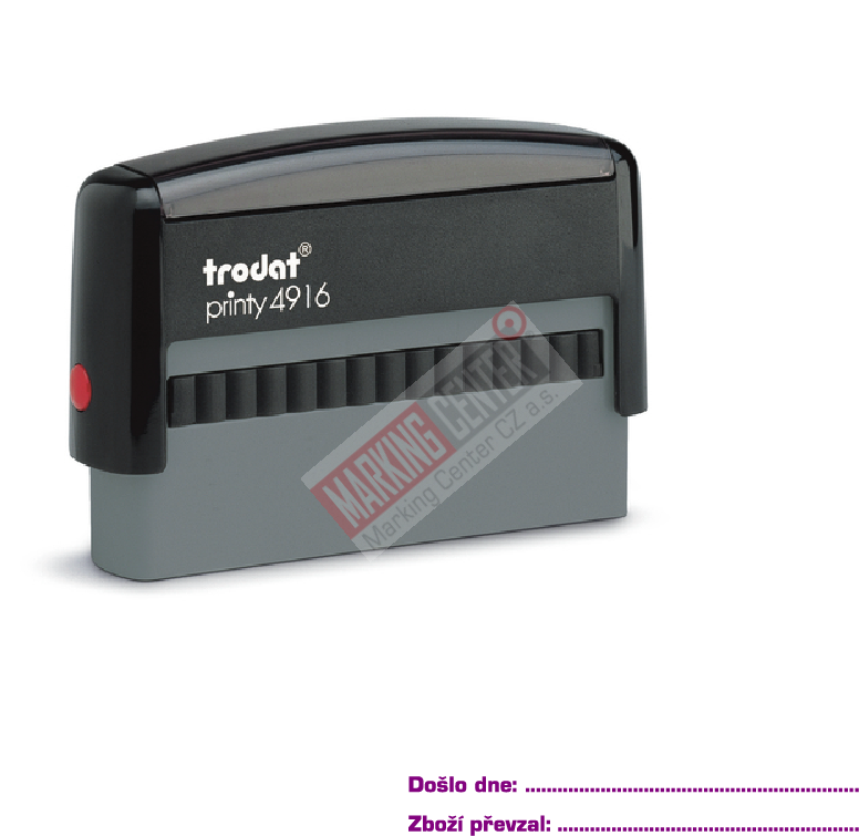 Razítko Trodat Printy 4916* Plastové samobarvicí razítko Trodat Printy 4916, maximální rozměr otisku je 69x9 mm. barva strojku: černá barva otisku: černá, modrá, červená, zelená, fialová náhradní polštářek: 6/4916 Jak objednat razítko ? Po výběru barvy strojku a otisku pokračujte vložením do košík... celý popis